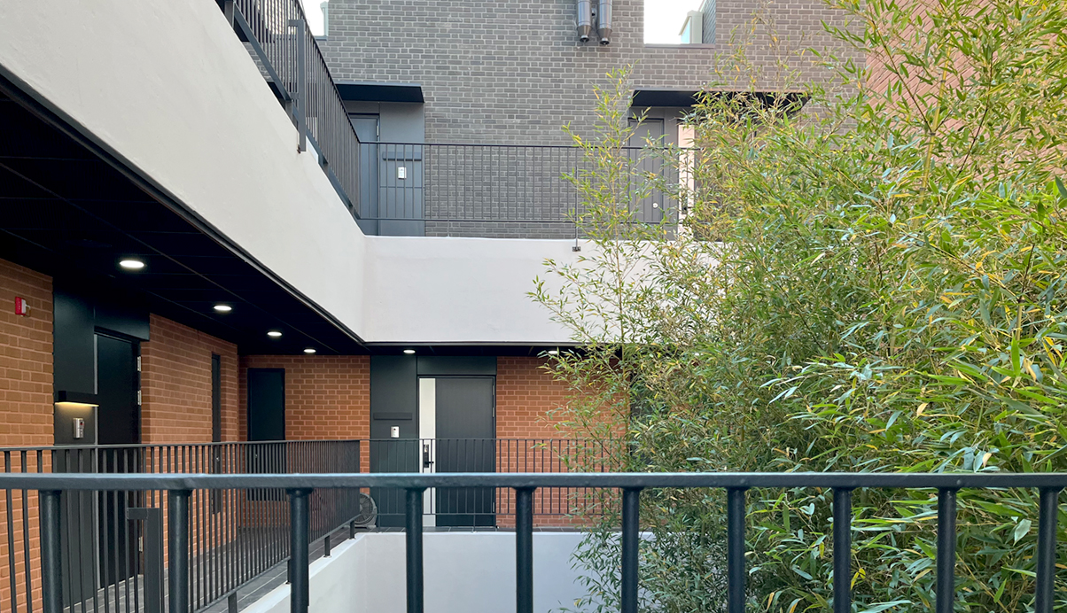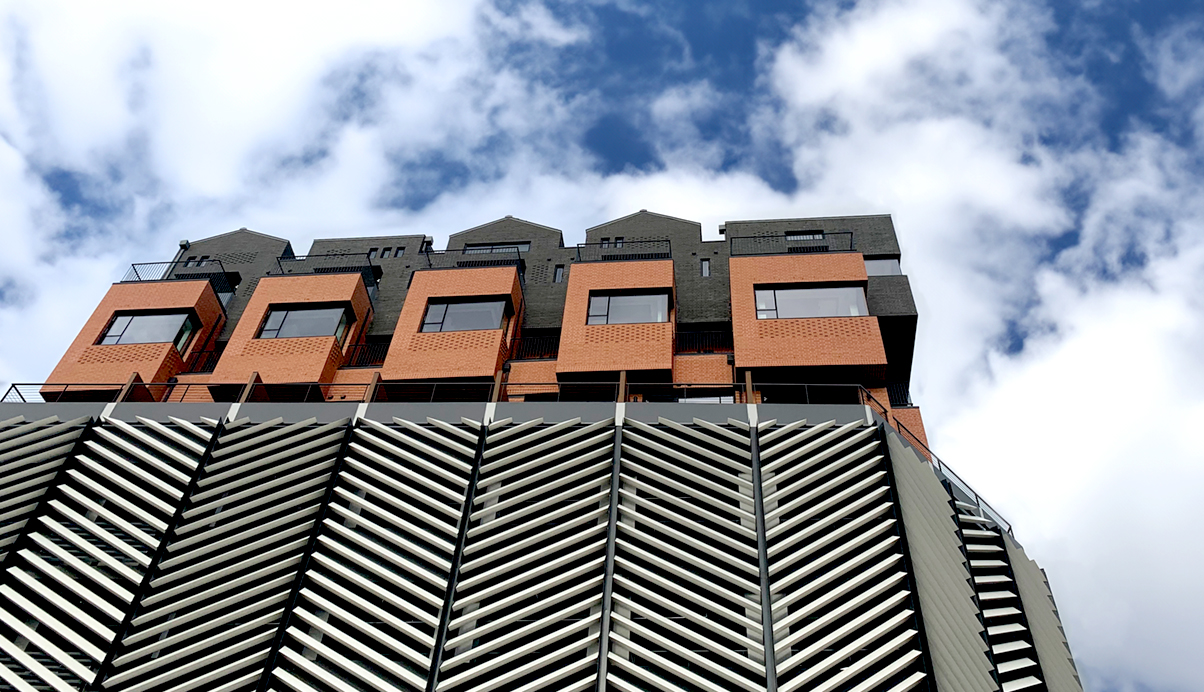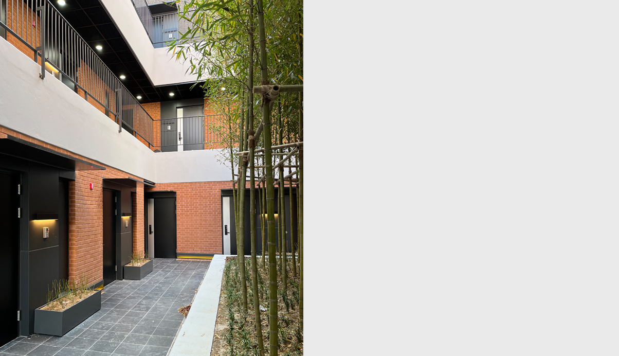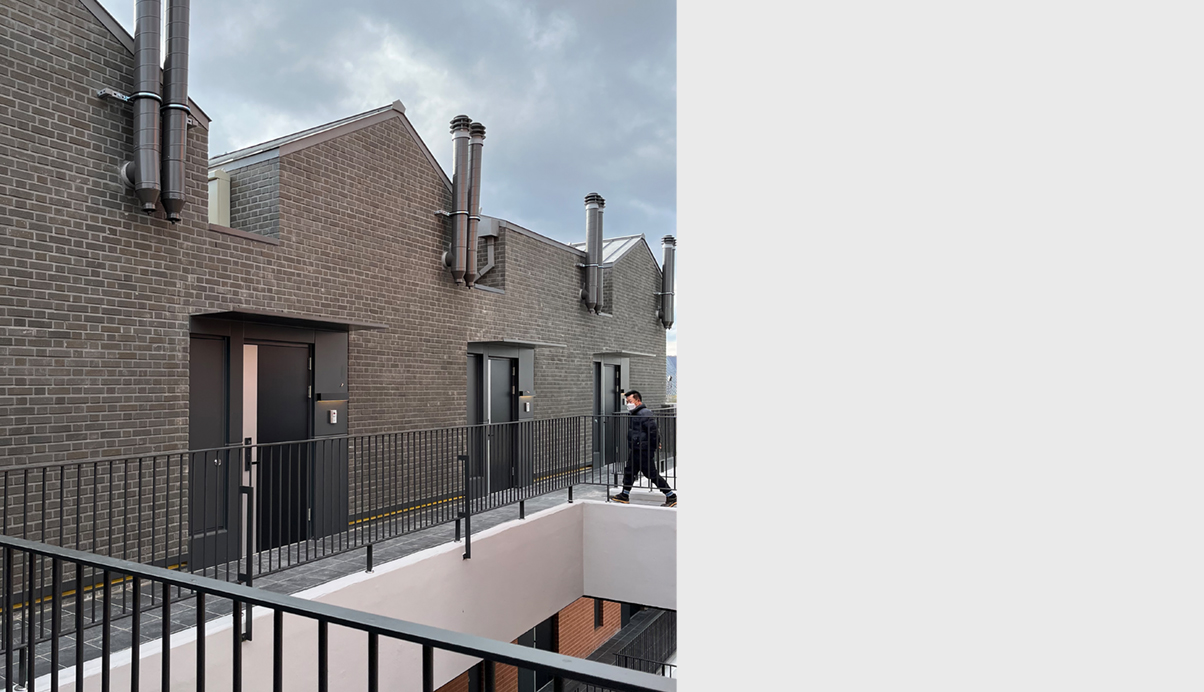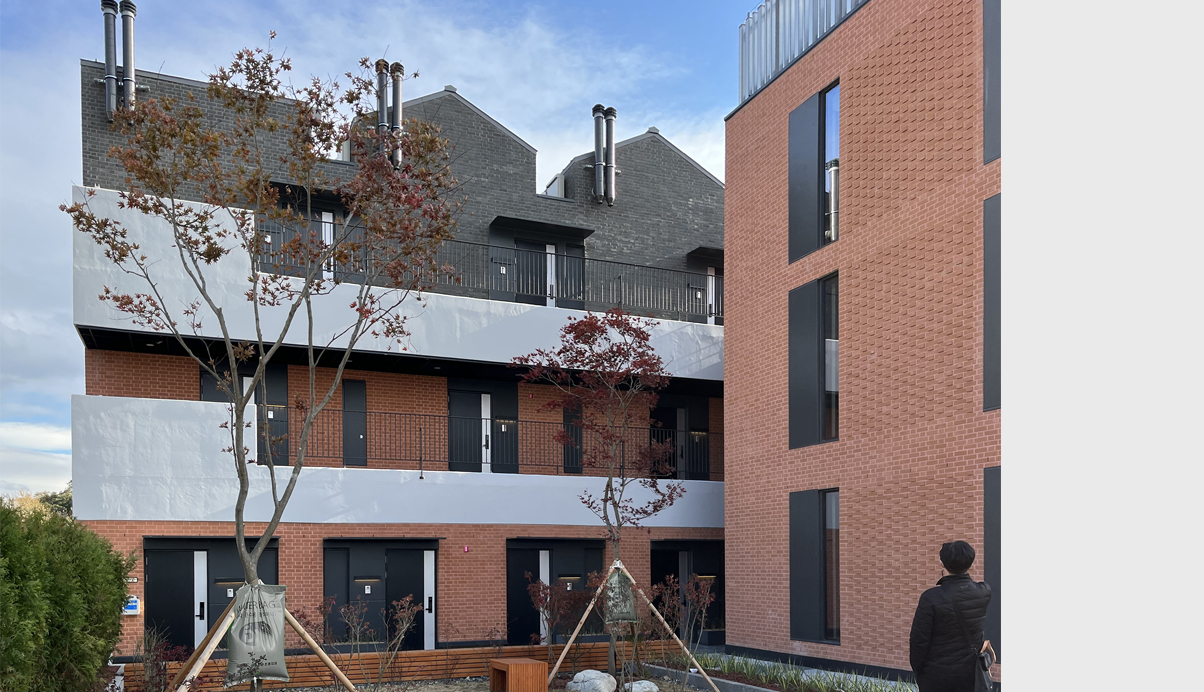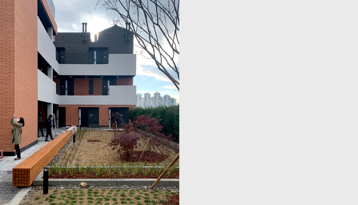 주차장 옥상을 마당으로 가지는 오피스텔은 ‘마을 만들기’란 주제로, 일반적인 판상형의 오피스텔이 아닌 모든 세대가 발코니를 가지고 세대 앞 마당을 공유하는 어릴적 뛰놀던 추억의 주택가 마을을 재현한다. 벽돌과 경사지붕이라는 재료와 형태에서 주는 공간은 옛 감성을 더욱 돋아나게 하며, 새로운 트렌드를 이끌어 나갈 것이라 기대한다.