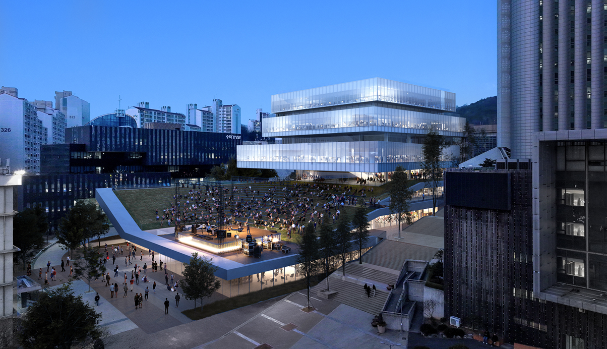 캠퍼스는 남쪽도로로부터의 대지의 폭이 좁아 캠퍼스의 깊이 가 드러나지 않고 녹지와 외부공간의 연계가 약해 캠퍼스가 삭막한 인상을 준다. 따라서 정문에서부터 진입광장, 중앙도서관에 이르는 축을 강조하여 경사방향의 위계를 활용하고 진입광장 슈파크와 중앙광장의 연계를 통해 외부경관의 깊이를 구성해야한다. 새로 계획된 숭실대학교 교육연구시설의 대지는 교차도로의 코너, 지하철역에서 연결되는 입구로 들어서면 바로 펼쳐지는 경사의 광장에 있으며 현재는 도시에 드러나는 입구의 여유공간이자 축제의 광장으로 학생들에게 사랑받고 있기 때문에 이곳에 들어설 건물이 만들어낼 장소에는 시야가 넓게 트인 야외 공연장의 장소가 꼭 필요하다.