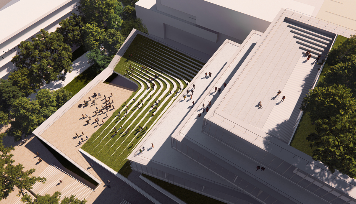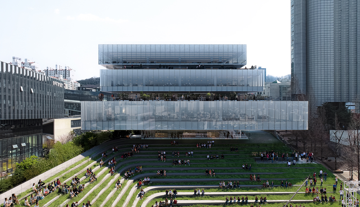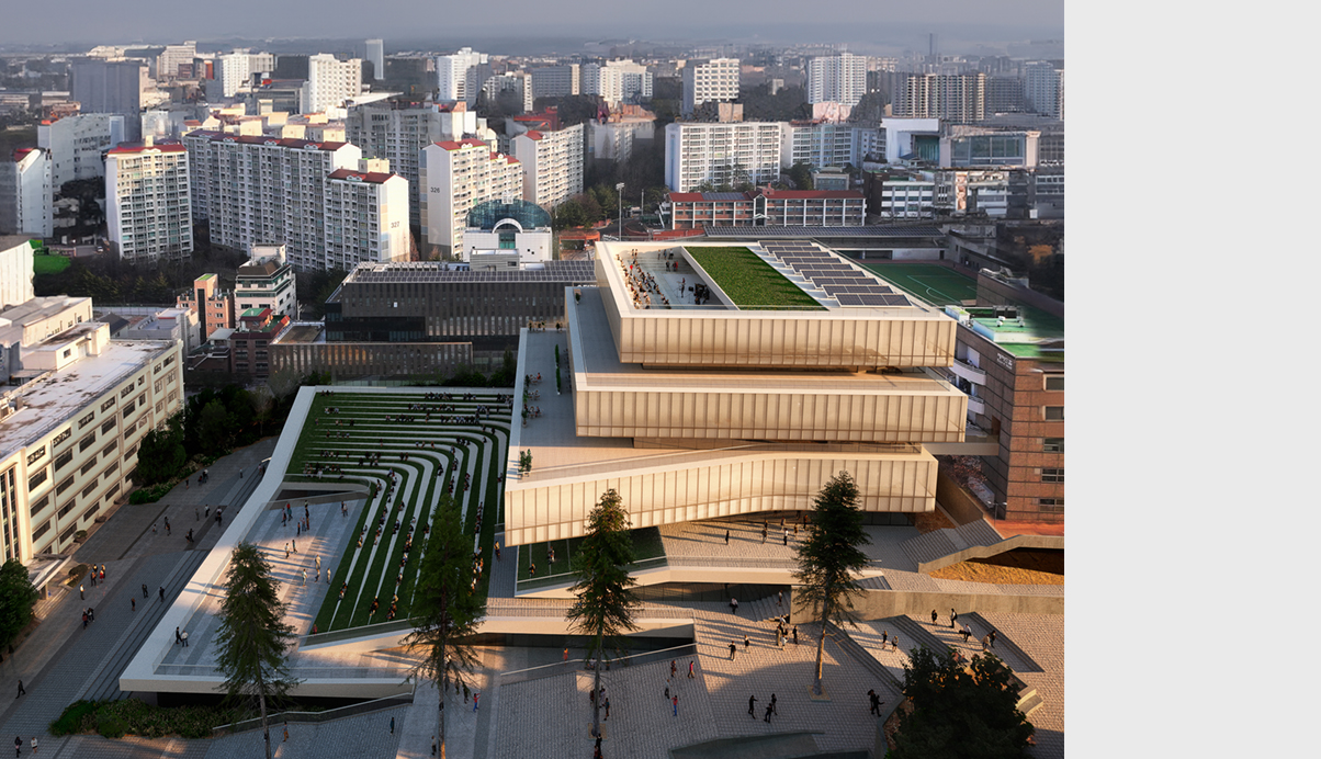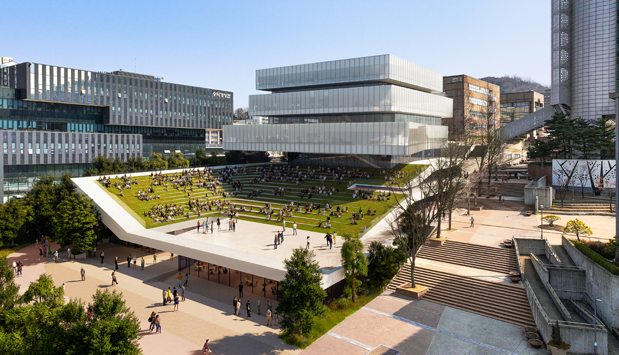 건물은 ‘비워진 장소’이자 대학 성장을 위한 ‘채워진 공간’으로 다양한 기능을 수용하는 창업 플랫폼이어야 한다. 팀의 제안은 넓고 채광이 필요하지 않은 프로그램을 경사를 따라 저층부에 쌓고 나머지를 주변건물의 간섭을 피해 최소화하여 뒤로 미루어 배치하는 것이다. 이로써 지형의 경사를 따라 뒤로 높아지는 낮은 포디움 상부에는 공연 관람이 가능한 넓은 광장이 형성되고 동시에 입구로서의 개방성도 유지하게 된다. 이 저층부의 양쪽 길은 학교의 입구에서 마스터플랜의 긴 축을 연결하는 여정의 시작이기도 하다. 그래서 한쪽은 기존 경사로를 따라 올라가며 레벨이 다른 시설 입구로 연결되고 다른 한쪽은 경사의 동선을 시설내부로 길게 이어지도록 끌어들여, 건물 저층부의 열린 공간에 활기를 주며 학교의 동선축을 안내한다. 건물의 나머지 프로그램은 경사형 포디움 뒷편에 정방형으로 자리잡고, 정면을 바라보는 오픈플랜을 통해 수직으로 연결된다. 이 공간은 수평으로 나누어진 적층의 형태로 쌓여 건물을 둘러싼 외부 공간을 풍부하게 만들어주며 학교의 기존 컨텍스트를 완성할 것이다.