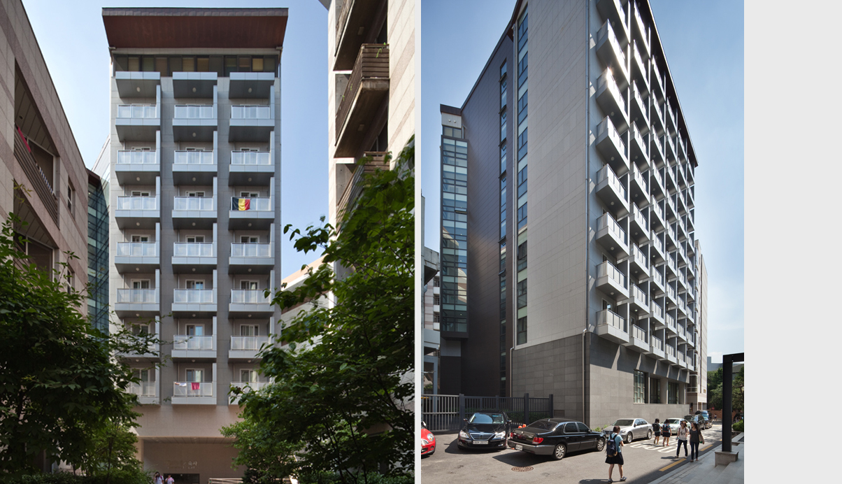 이화여자대학교 국제기숙사는 부족한 기숙사를 보완하고 교직원 및 국제교류학생들을 위한 기숙사이다. 협소한 부지을 효율적으로 활용하고, 기존 글로벌타워와의 디자인 연계와 이화여자대학교 마스터플랜에서의 조화로움을 구현하고자 했다. 지하1층 지상10층의 75실 규모로 학생들을 위한 지하 문화사랑방과 세탁실, 클럽실, 독서실을 갖추고 있으며, 옥상에 커뮤니티 라운지와 간이 스낵바를 구성하였다. 유닛별 디자인발코니 계획을 통해 기숙사유닛의 환경성을 개선하고 단조로운 입면을 극복하였다. 이화여자대학교의 작지만 많은 꿈과 이야기를 만들어내길 기대해본다.