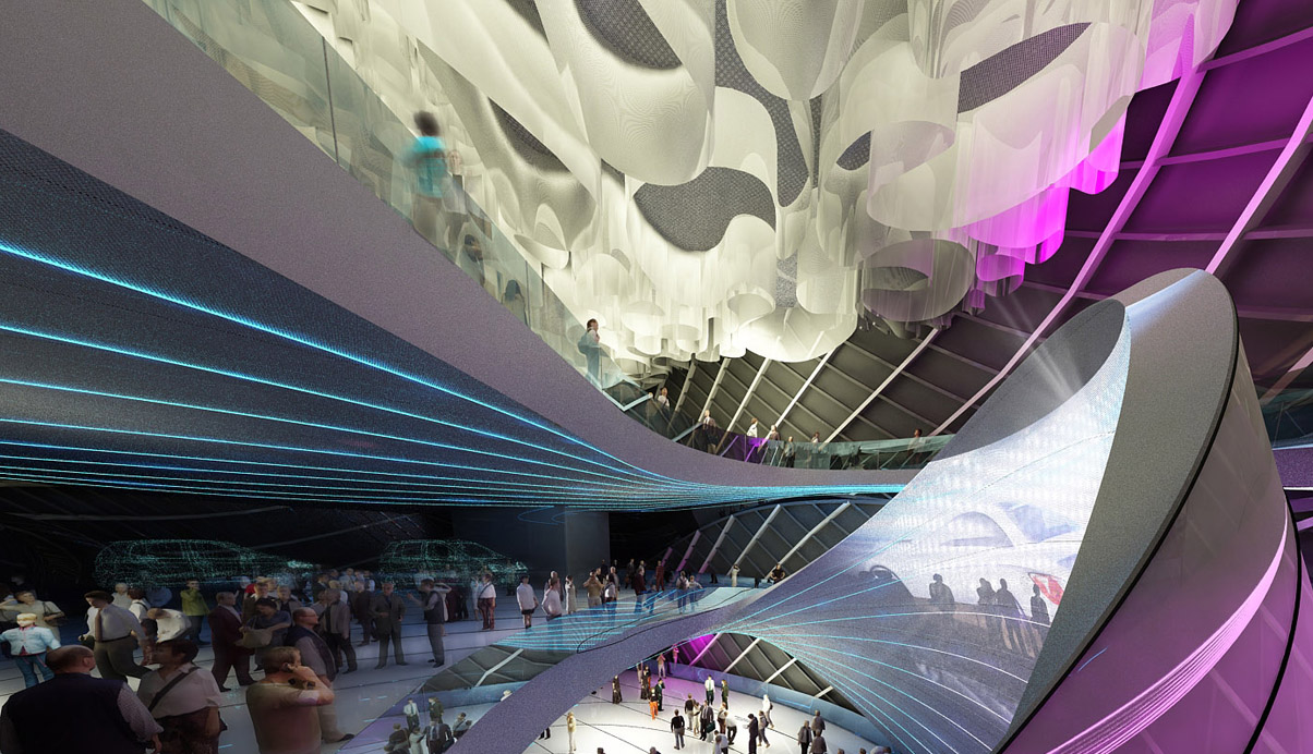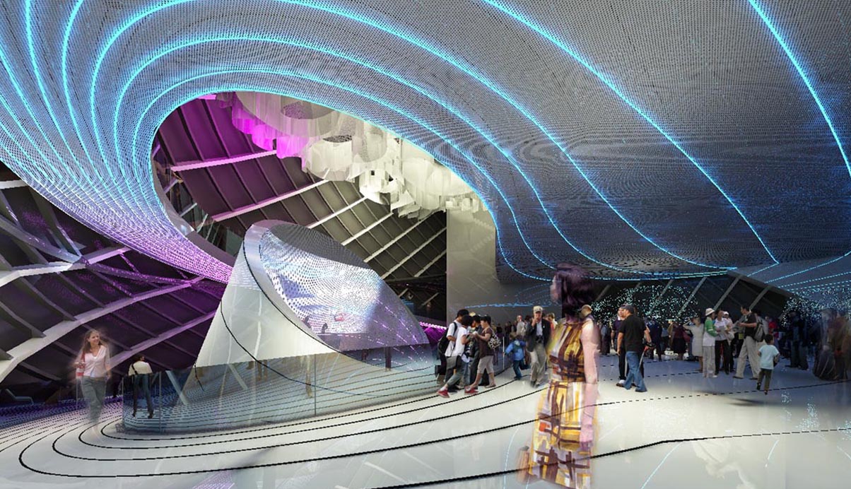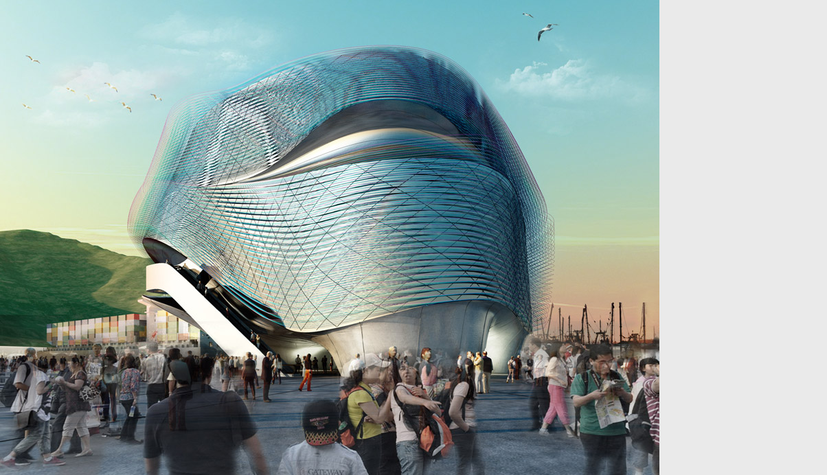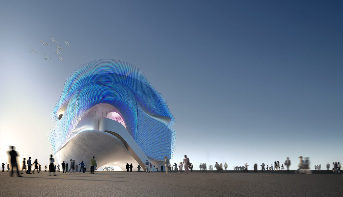 건물의 바닥에서부터 올라오는 다이나믹한 금속벽체는 3층의 주 전시공간과 어우러지고 이러한 전시동선의 내재적인 움직임은 외피의 형태를 연상시킨다.건축물은 감성적인 층위를 파빌리온에 더하는 볼륨감을 주는 움직이는 선들로 녹아들어 간다. 그 선들은 아날로그적인 방법을 통해 진동하며 변화하는 효과를 만들어 주는 참신하면서도 두드러진 요소가 될 것이다.