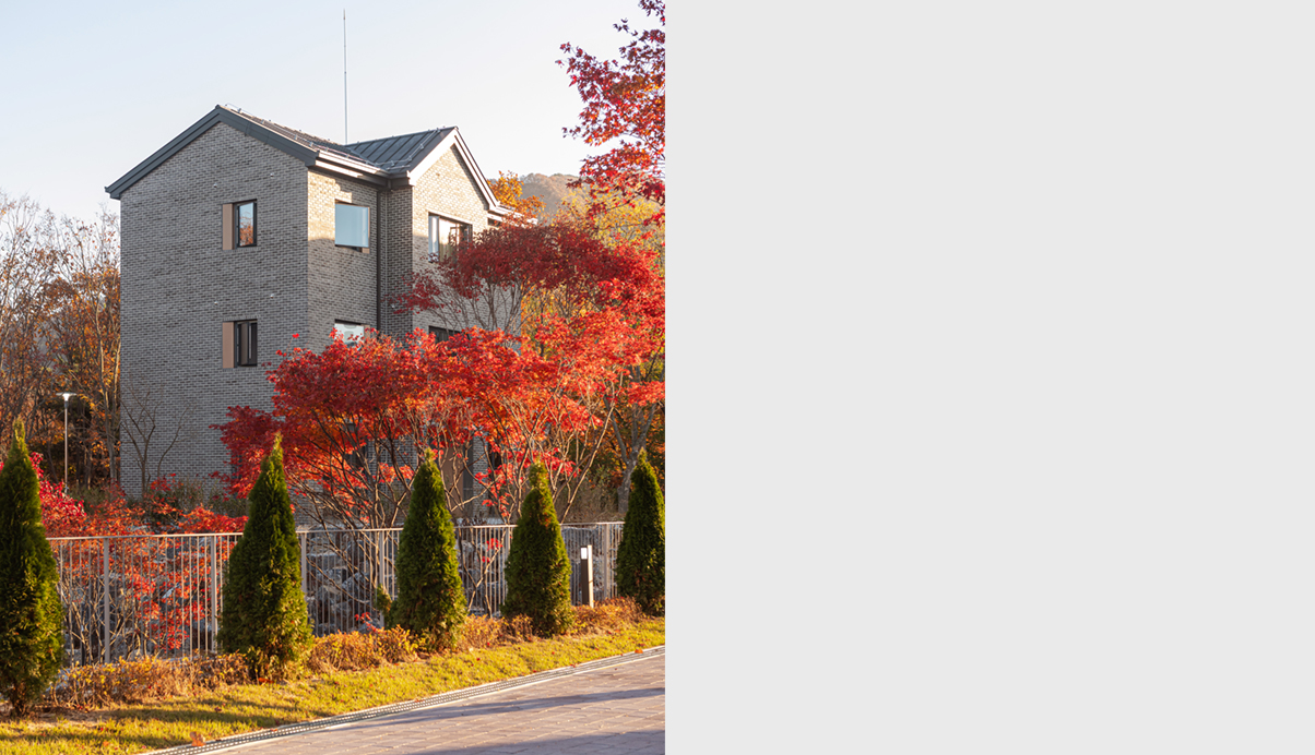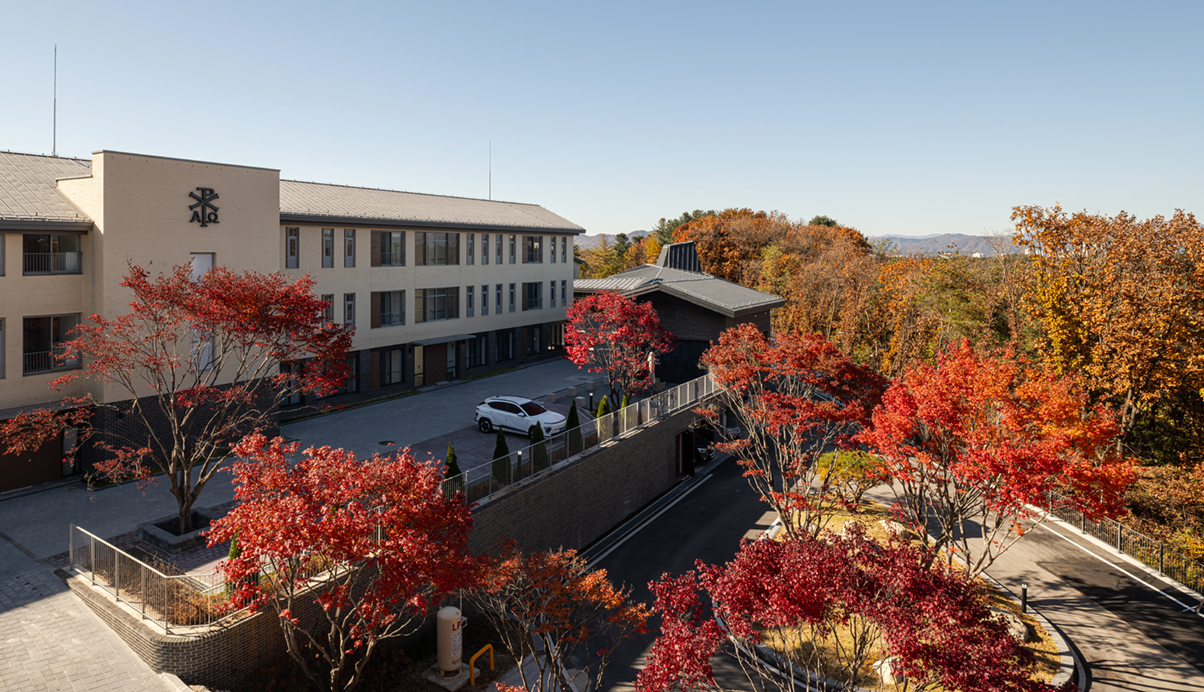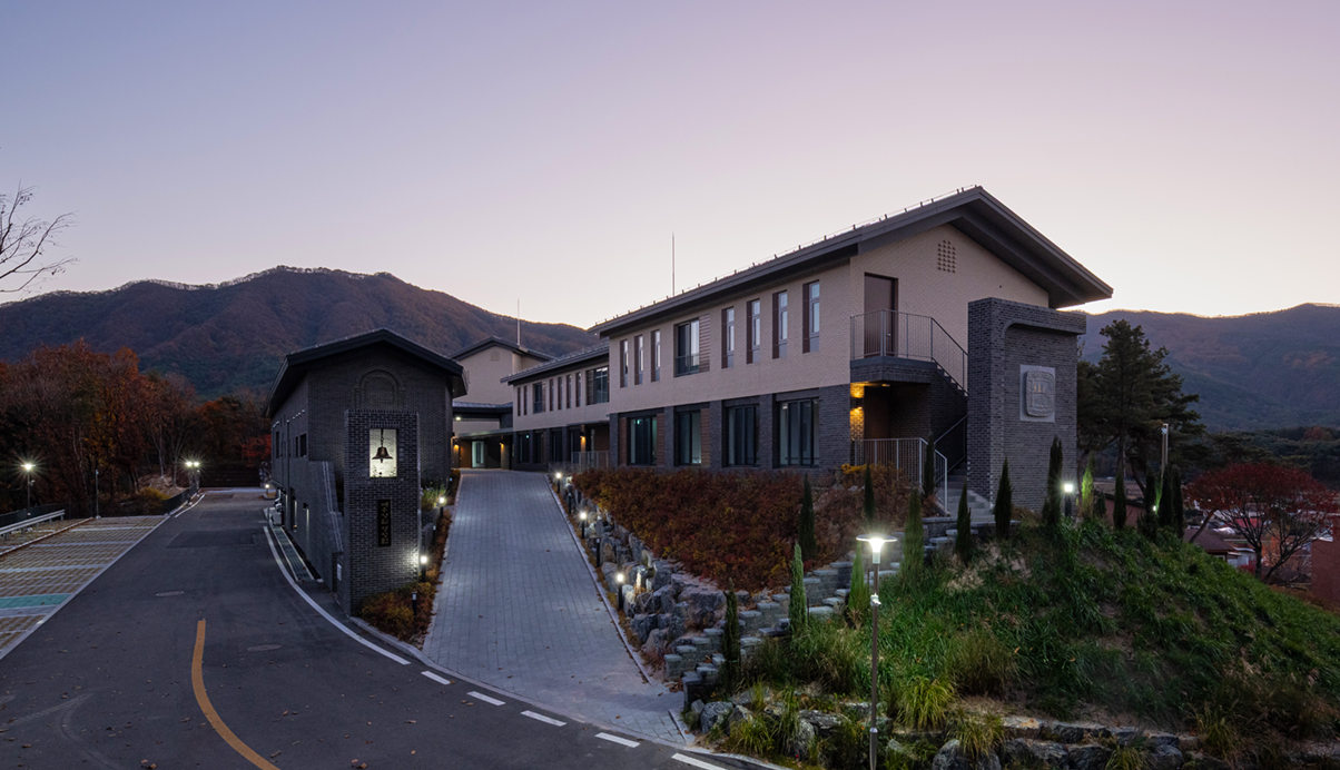 은퇴한 사제들이 소규모 공동체를 이루어 생활하는 수도원으로 춘천시 인근에 위치한다. 단순한 종교시설이 아닌 남은 여생을 살아가는 마을로 느껴질 수 있도록 시설을 하나로 엮는 마당을 계획하여 커뮤니티의 중심공간이 되도록 했다. 마당은 하루의 일과를 보내는 동안 자연스럽게 사람들이 마주칠 수 있도록 동선을 구성하고, 곳곳에 다양한 삶의 모습이 마당에 담기도록 했다. 언덕에 위치한 협소한 대지를 합리적으로 활용하기 위해 능선을 따라 사제관을 배치해 전실 남향 채광과 열린 조망을 확보했다. 식당, 공동거실 등의 주요시설은 사제관 후면에 배치해 동선을 집중하고, 경당은 상징적인 입면과 공간을 갖는다. 사제관과 공동시설의 서로 다른 디자인 어휘는 각 시설의 성격을 나눠주는 동시에 시설 내의 풍경을 다양하게 만들어준다. 개인실은 쾌적하고 건강한 거주공간인 동시에 성찰과 수도의 공간이 되도록 구성했다.
