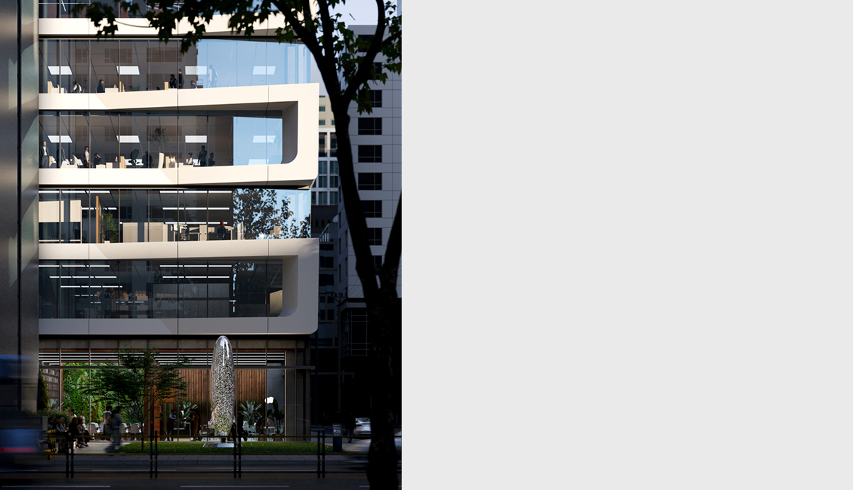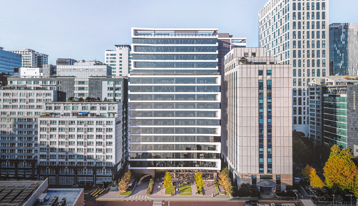 P-GENESIS는 지상 17층 규모의 업무시설로, 강남대로에서 한 켜 물러나 도시적 전면 공지와 적절한 거리감을 확보하도록 배치되었다. 대지는 다양한 시대와 건축 언어가 혼재하는 강남 후면 도시경관 속에 위치하며, 이에 대응해 정제된 수평 띠의 적층 매스를 적용하여 차분하고 질서 있는 도시적 파사드를 구현하였다. 모서리부는 전면 돌출로 거리에서의 인지성과 상징성을 확보하고, 띠와 코너 요소는 입면 조건에 따라 사면 처리와 두께 변화를 적용하여 입면 리듬과 깊이감을 강조하였다. 남측 입면에는 BIPV 시스템을 파사드 구성 요소로 통합하여, 단순 설비가 아닌 입면 디자인의 일부로서 지속가능성과 조형적 완결성을 동시에 확보한 설계 전략을 구현하였다.